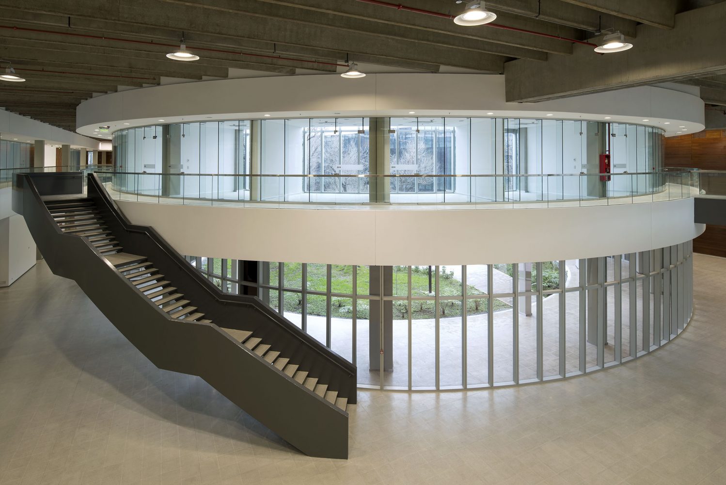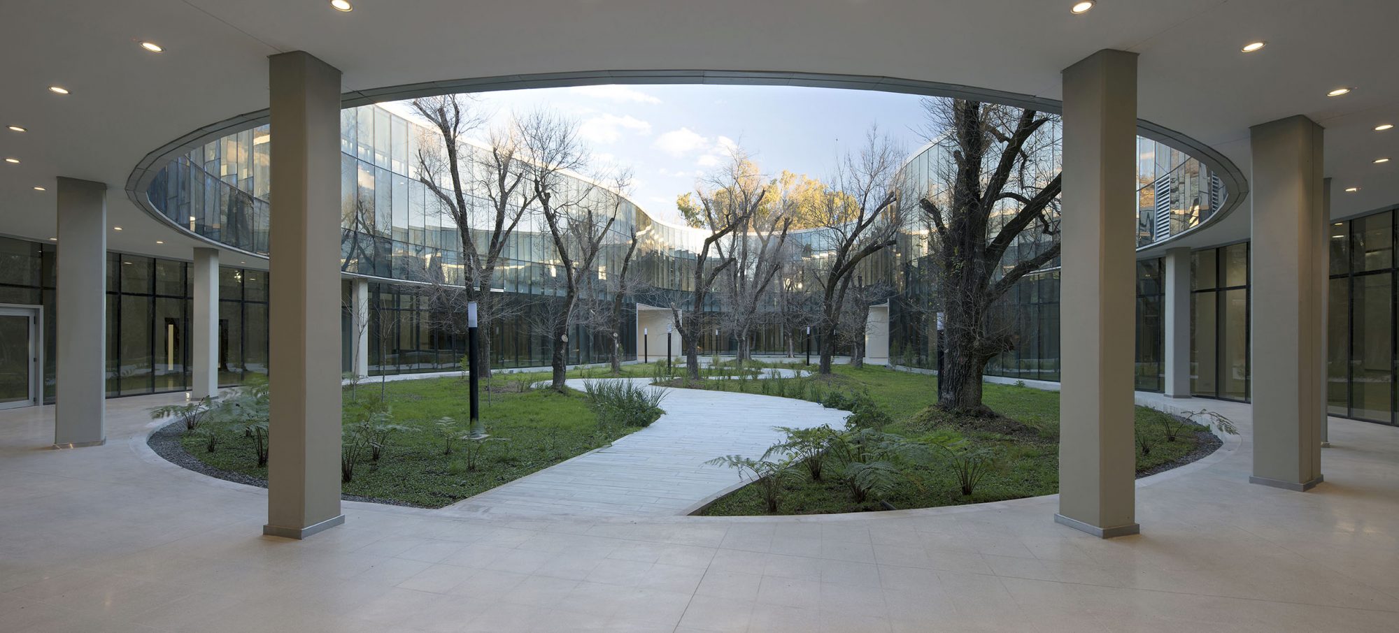The building innovatively responds to the site which it occupies and provides occupants with lively gathering spaces and an energizing research environment. Two curving courtyards intersect expansive indoor gathering and study areas, carving out space for clusters of exotic trees and preserving native trees that predate the development site. The courtyards also integrate the building into the campus via an open passageway that runs directly from the west to the east end of the building, straight through one courtyard to an outdoor terrace, connecting the building to the old facility adjacent to it. One of the most prominent features of the building, which reflects a quality found in most buildings in South America, is that the enclosed space is flooded with daylight and natural ventilation via the two interior courtyards located in the central atrium. On the ground level, these areas are bordered by a cafeteria and student lounges, and on the second level by research laboratories that overlook the gardens.