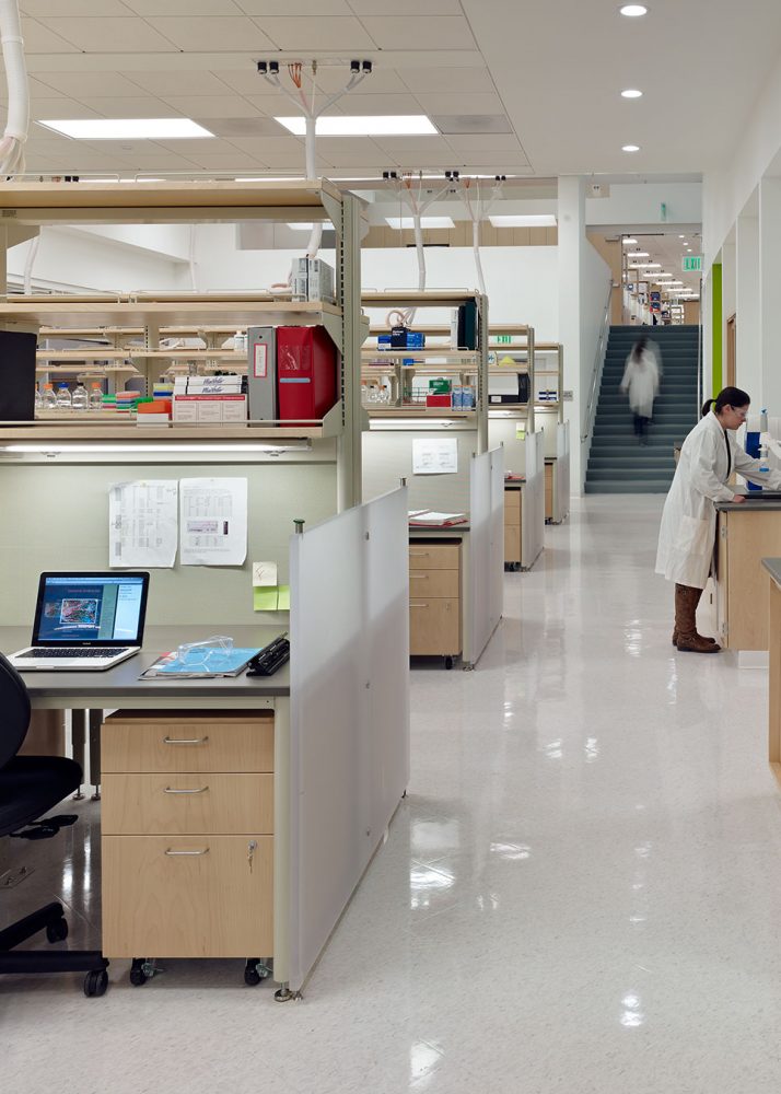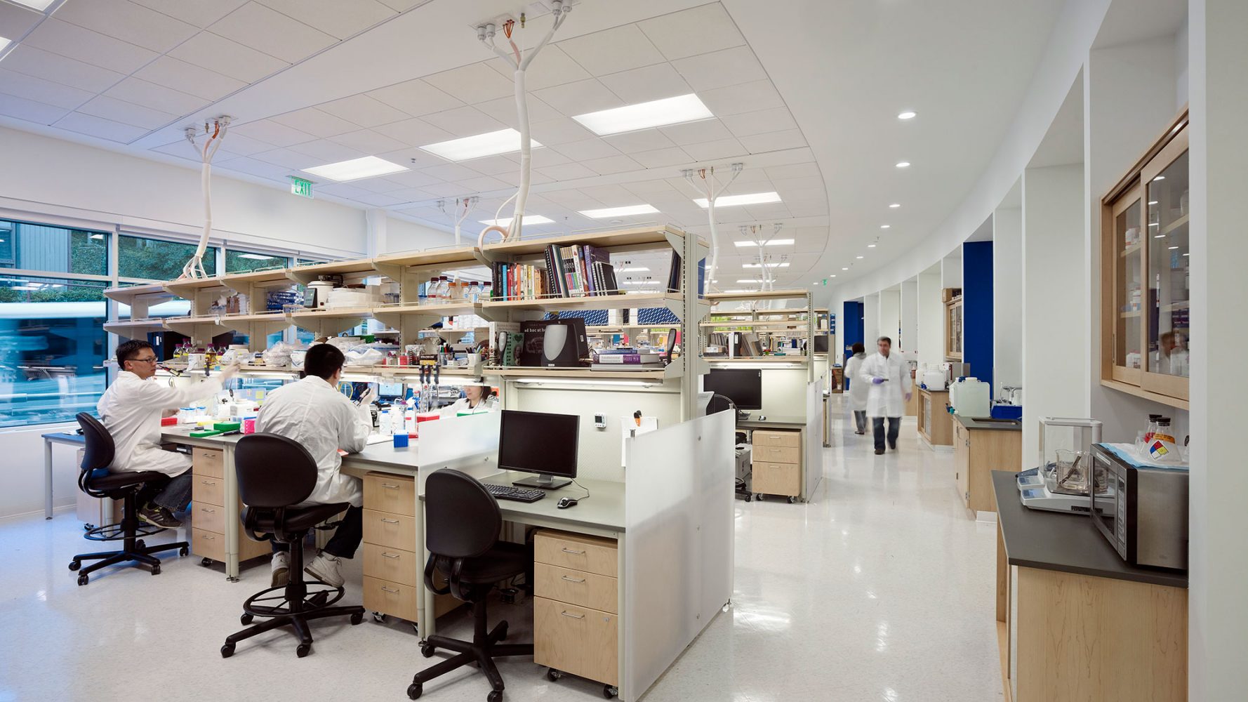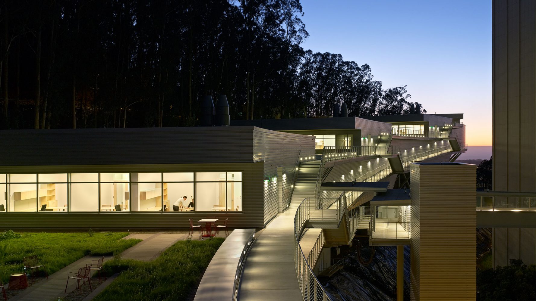 Dentro del edificio, las transiciones entre niveles están diseñadas para ser focos de actividad. Las salas de descanso y las escaleras ubicadas en estos puntos de transición aumentan las posibilidades de interacción casual, y el acristalamiento interior maximiza la conectividad visual entre los laboratorios inferiores y las oficinas superiores. Para promover aún más la colaboración, los laboratorios ocupan un plano de planta abierto y horizontal, con un sistema de módulos de trabajo flexibles y diseñados a medida, lo cual permite la rápida reconfiguración del programa de investigación. La abundancia de ventanales orientados hacia el sur inunda de luz natural los laboratorios abiertos y las oficinas, además de proporcionar vistas hacia la ladera boscosa del monte Sutro.