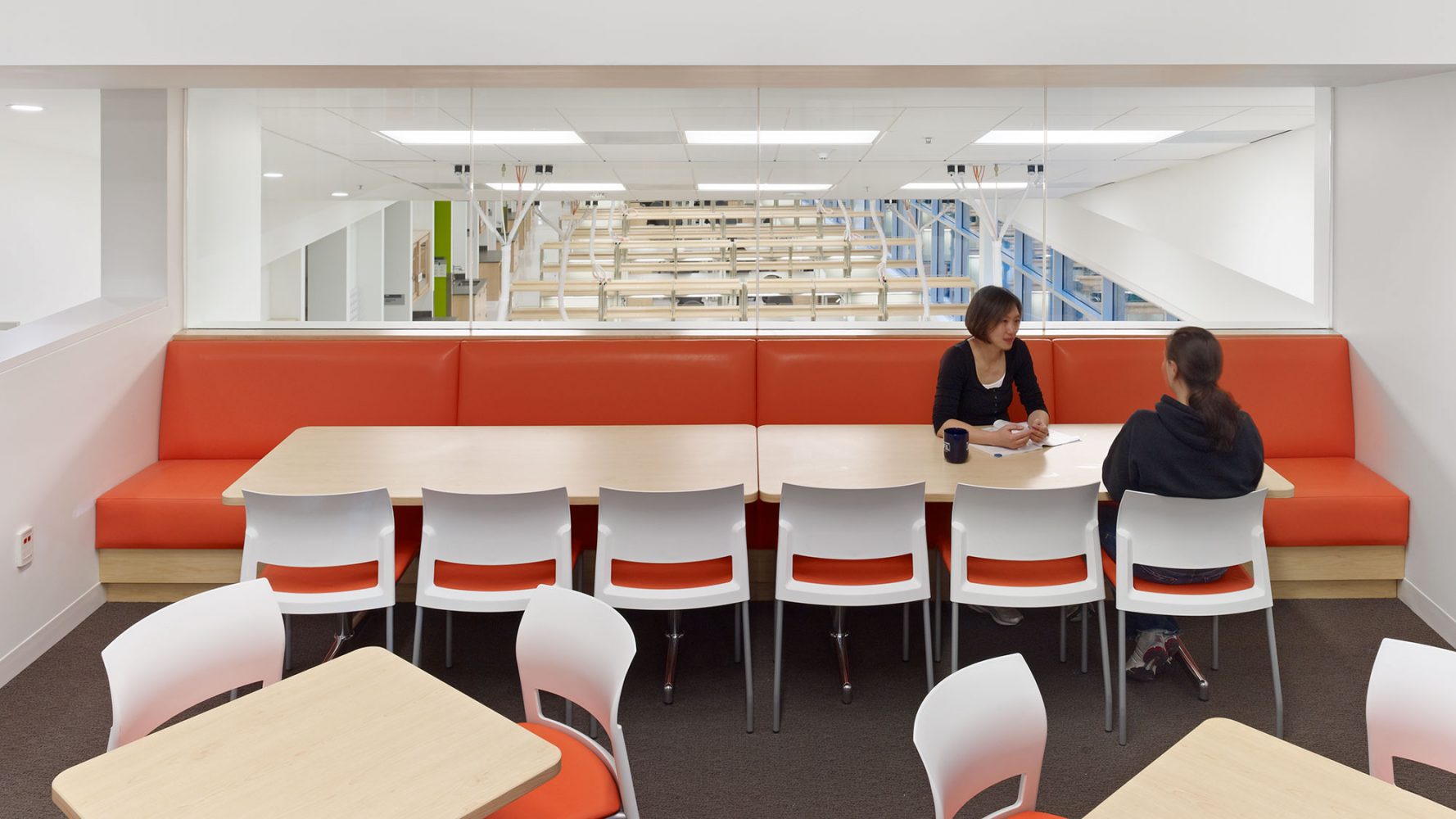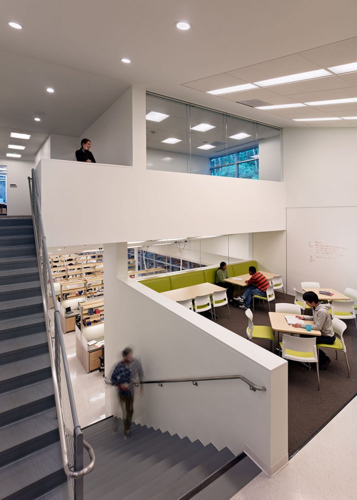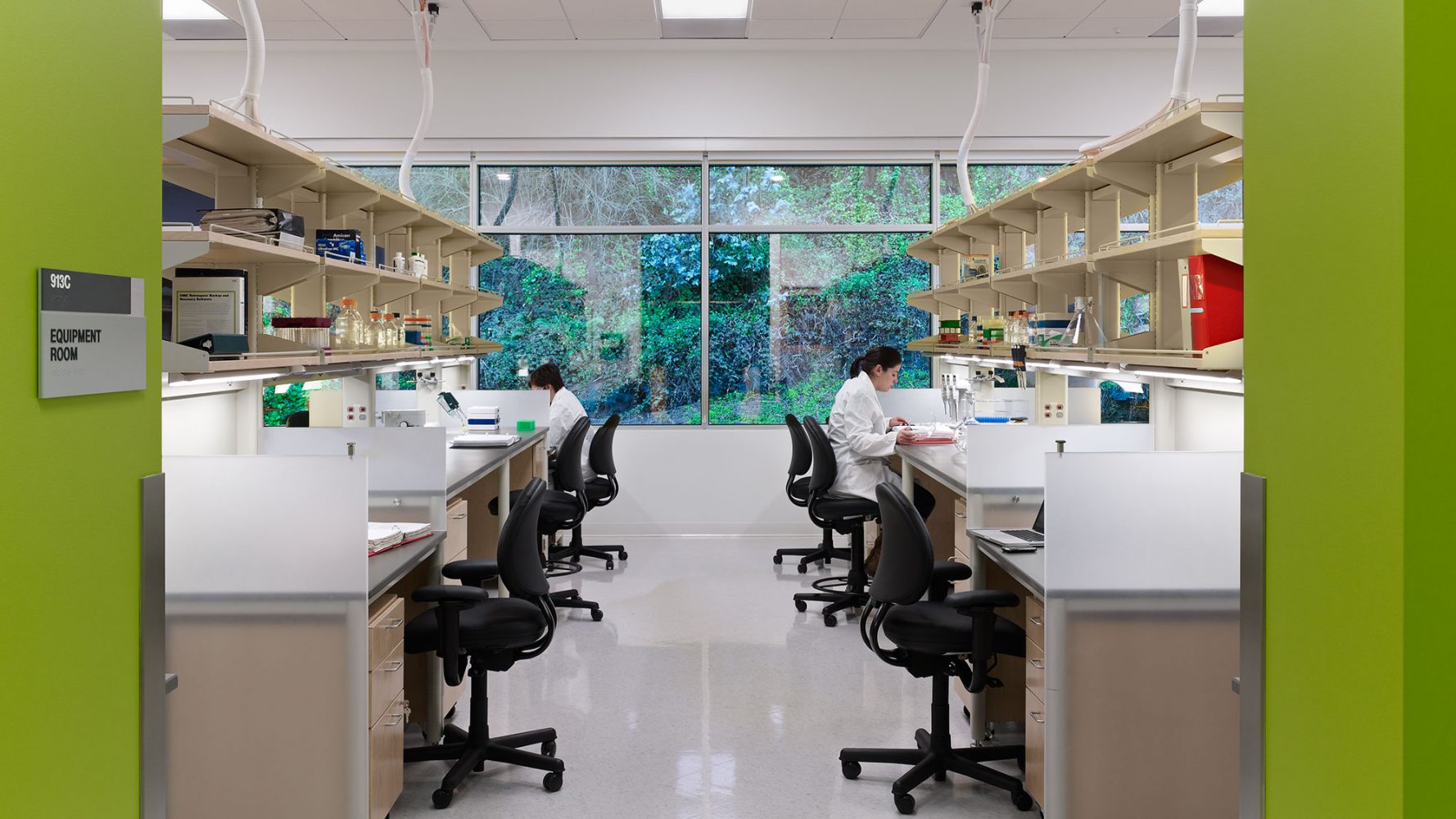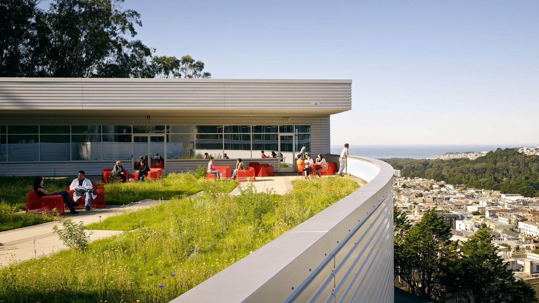 Dentro del edificio, las transiciones entre niveles están diseñadas para ser focos de actividad. Las salas de descanso y las escaleras ubicadas en estos puntos de transición aumentan las posibilidades de interacción casual, y el acristalamiento interior maximiza la conectividad visual entre los laboratorios inferiores y las oficinas superiores. Para promover aún más la colaboración, los laboratorios ocupan un plano de planta abierto y horizontal, con un sistema de módulos de trabajo flexibles y diseñados a medida, lo cual permite la rápida reconfiguración del programa de investigación. La abundancia de ventanales orientados hacia el sur inunda de luz natural los laboratorios abiertos y las oficinas, además de proporcionar vistas hacia la ladera boscosa del monte Sutro.