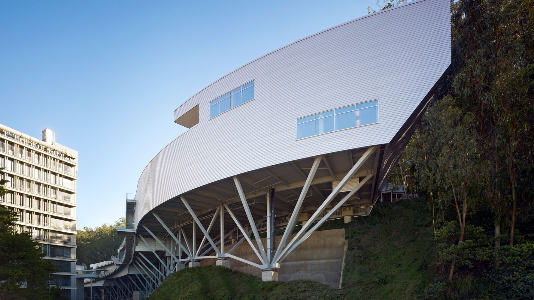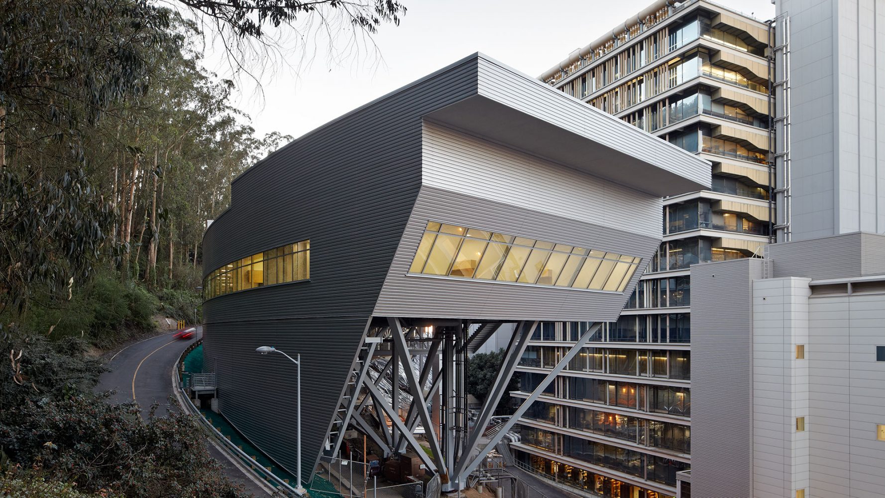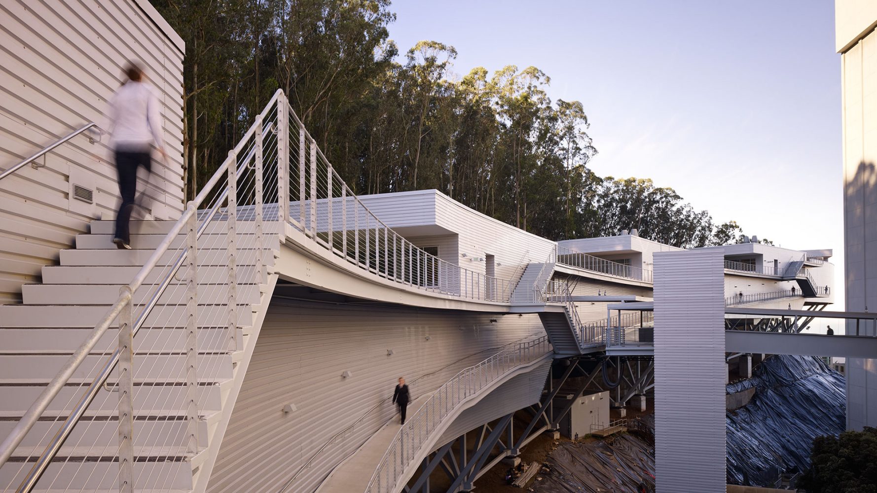 Dado que el emplazamiento del edificio era un terreno muy inclinado al pie del monte Sutro, el cliente esperaba una estructura organizada verticalmente. Esto podría haber llevado a la creación de una serie de plantas pequeñas y superpuestas, que quizás no se habrían ajustado a las necesidades de investigación del instituto. Basándose en experiencias previas del estudio, que confirmaban el diseño horizontal como el más adecuado para la organización interna de los laboratorios y para la colaboración entre investigadores, Viñoly halló la manera de planificar un edificio horizontal a pesar de los desafíos que planteaba el emplazamiento. Cuatro plantas separadas en niveles se escalonan descendiendo por la ladera en tramos de medio nivel y permiten que la planta principal funcione como un laboratorio continuo. Cada descenso de medio nivel se encuentra coronado por un conjunto de oficinas y una cubierta verde. Aprovechando el clima templado de la región, se proporciona una circulación continua entre todos los niveles por medio de rampas y escaleras exteriores. Las instalaciones están conectadas con tres edificios cercanos dedicados a la investigación y la medicina –ciencias médicas, ciencias de la salud oeste y ciencias de la salud este– a través de puentes peatonales. La estructura del edificio se apoya en estructuras metálicas sobre pilares de hormigón, lo cual minimiza la excavación en el emplazamiento y permite la incorporación de aislamiento sísmico de base para absorber las fuerzas sísmicas.