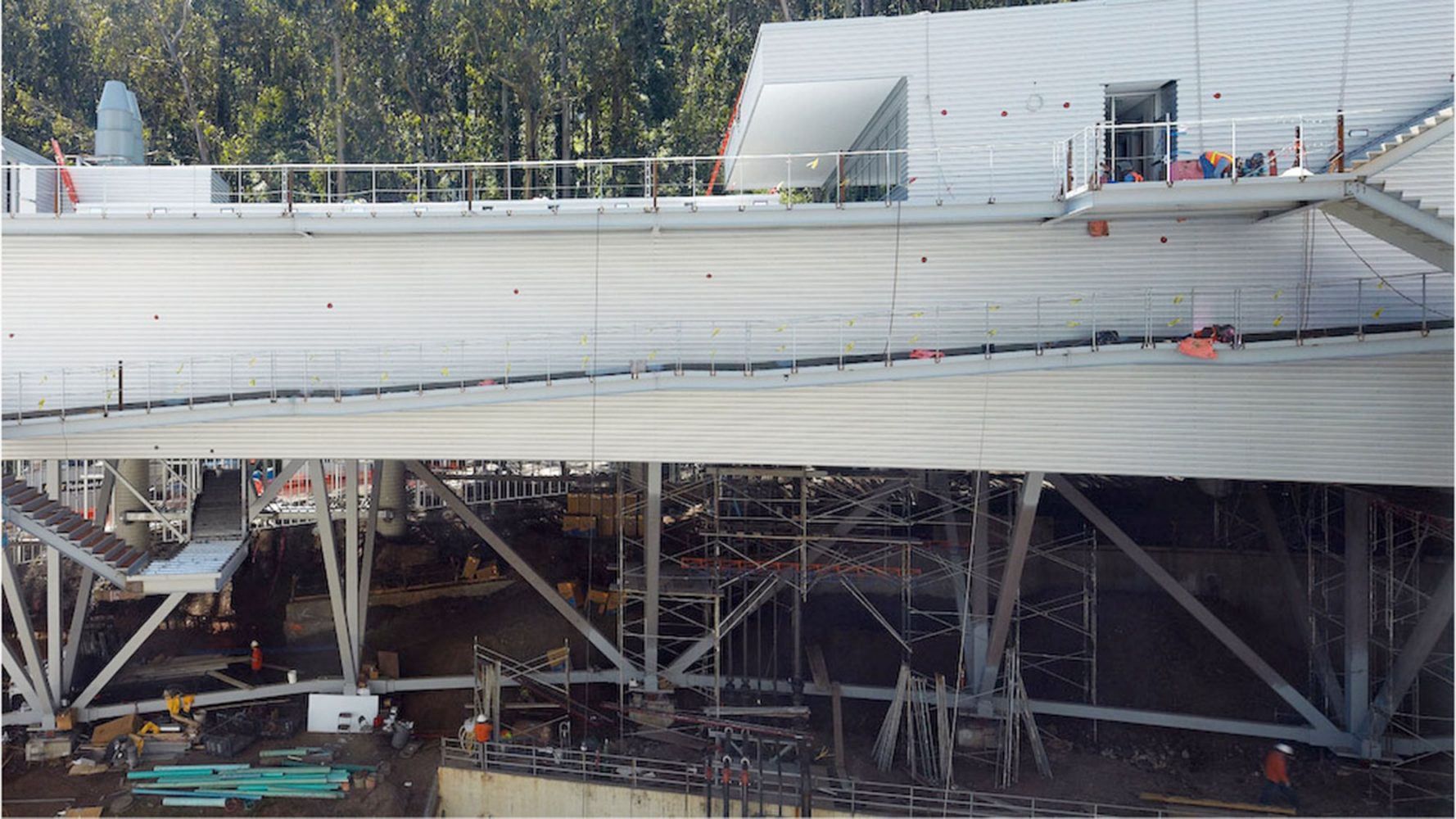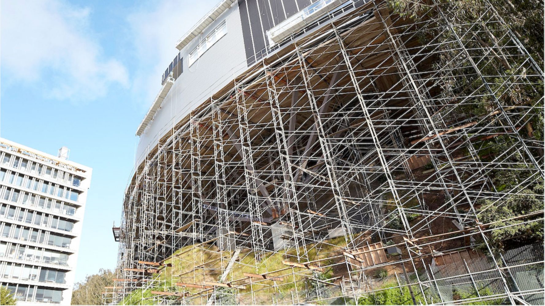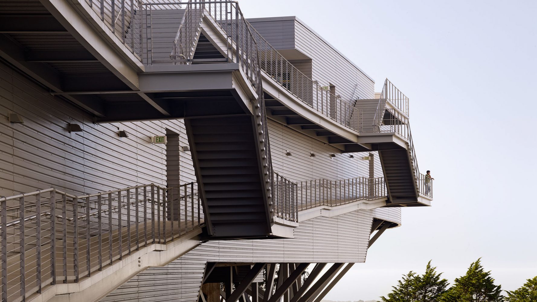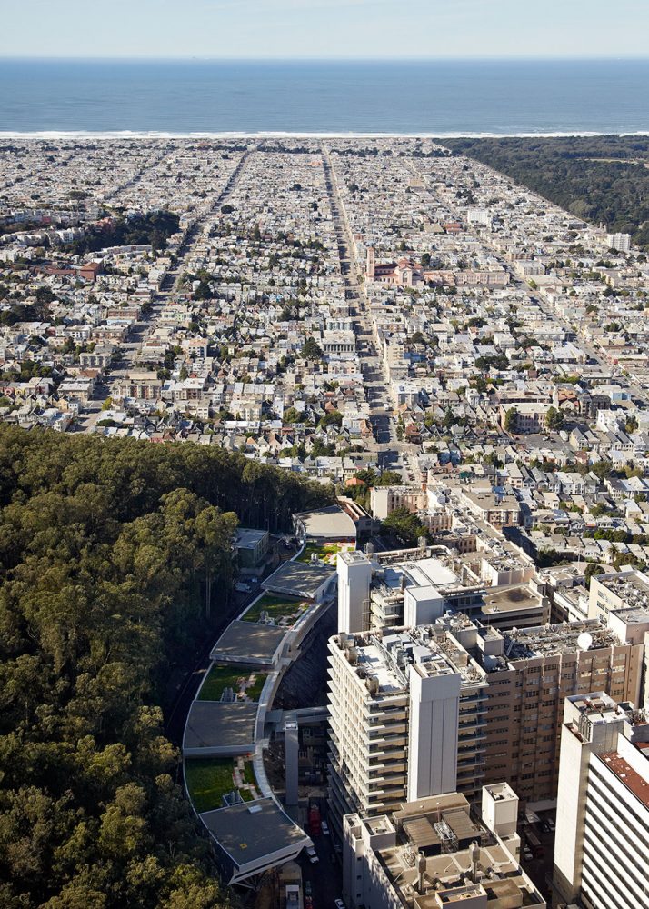 Dado que el emplazamiento del edificio era un terreno muy inclinado al pie del monte Sutro, el cliente esperaba una estructura organizada verticalmente. Esto podría haber llevado a la creación de una serie de plantas pequeñas y superpuestas, que quizás no se habrían ajustado a las necesidades de investigación del instituto. Basándose en experiencias previas del estudio, que confirmaban el diseño horizontal como el más adecuado para la organización interna de los laboratorios y para la colaboración entre investigadores, Viñoly halló la manera de planificar un edificio horizontal a pesar de los desafíos que planteaba el emplazamiento. Cuatro plantas separadas en niveles se escalonan descendiendo por la ladera en tramos de medio nivel y permiten que la planta principal funcione como un laboratorio continuo. Cada descenso de medio nivel se encuentra coronado por un conjunto de oficinas y una cubierta verde. Aprovechando el clima templado de la región, se proporciona una circulación continua entre todos los niveles por medio de rampas y escaleras exteriores. Las instalaciones están conectadas con tres edificios cercanos dedicados a la investigación y la medicina –ciencias médicas, ciencias de la salud oeste y ciencias de la salud este– a través de puentes peatonales. La estructura del edificio se apoya en estructuras metálicas sobre pilares de hormigón, lo cual minimiza la excavación en el emplazamiento y permite la incorporación de aislamiento sísmico de base para absorber las fuerzas sísmicas.