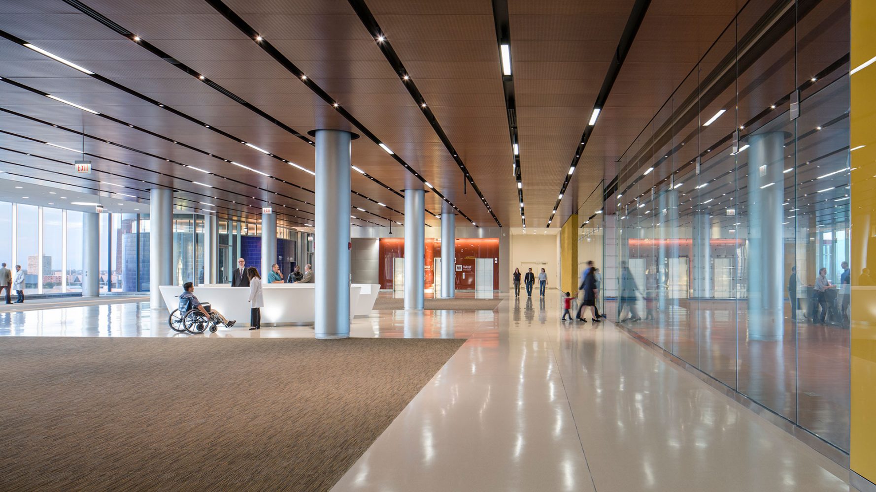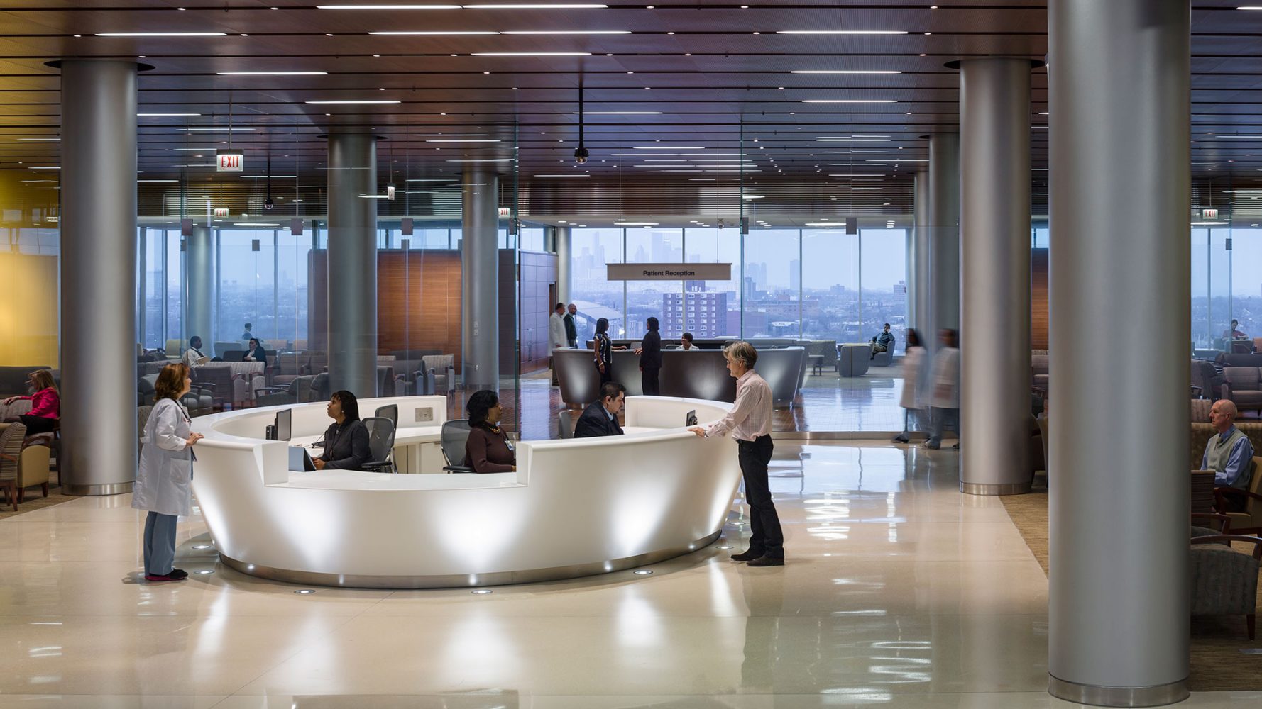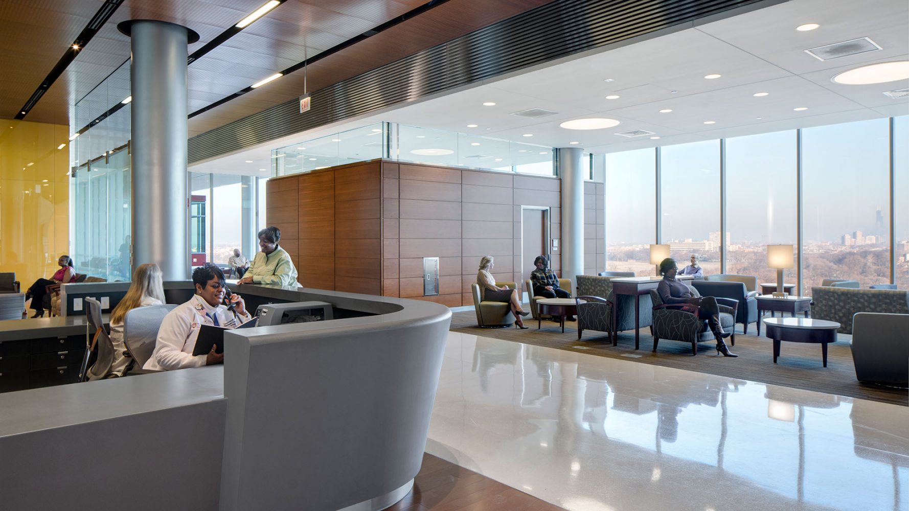 El Sky Lobby es un vestíbulo ubicado en el séptimo piso y cuenta con una recepción central, amplias salas de espera, salas de espera familiares, una capilla, una cafetería, un centro de conferencias y otros espacios públicos. Como núcleo del hospital, este vestíbulo efectivamente eleva a lo más alto el espacio social, contemplativo y exterior de unas instalaciones tradicionales, y proporciona a los visitantes amplias vistas de la universidad, el parque Washington, el lago Michigan y el horizonte del centro de Chicago. Desde un punto de vista arquitectónico, el vestíbulo elevado también supone una ruptura visual respecto a la masa vertical del edificio, ya que los espacios interiores de este nivel están alejados de la cara más externa y principal del edificio. Estos espacios contienen las unidades para pacientes arriba y las salas de procedimientos quirúrgicos abajo.