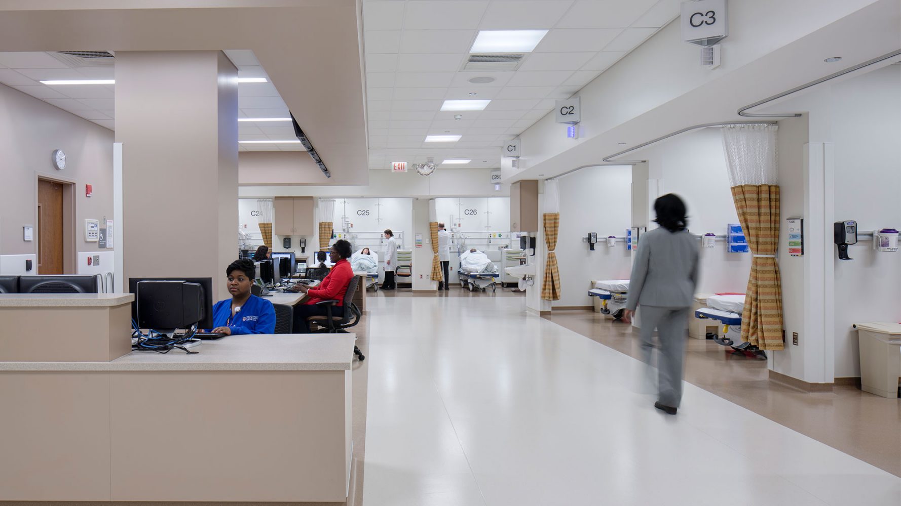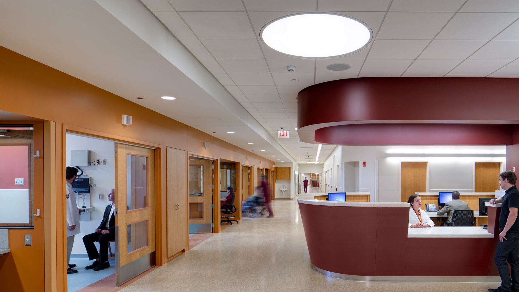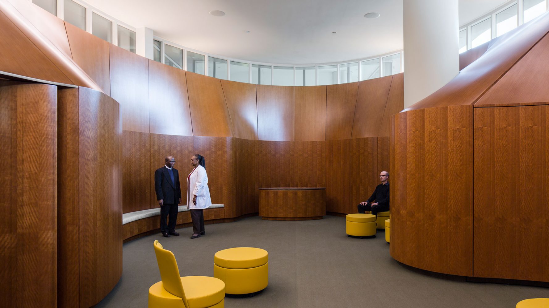 Se puede apreciar este concepto de diseño centrado en el paciente en varios niveles del centro. En las 240 habitaciones privadas para pacientes hay espacio suficiente para alojar a familiares cómodamente. Cada habitación tiene un sofá o sillón reclinable que se convierte en un espacio de descanso para un familiar además del paciente. Lograr que los pacientes y sus familias disfruten de privacidad fue una prioridad en el proceso de diseño de las habitaciones, así como ampliar la conexión visual entre pacientes y el personal de enfermería. Las salas de espera, ubicadas cerca de las habitaciones y enfermerías, proporcionan un espacio común para los visitantes en las plantas de pacientes y se puede acceder a ellas desde los ascensores principales. Las salas de espera comunes mantienen una escala íntima.