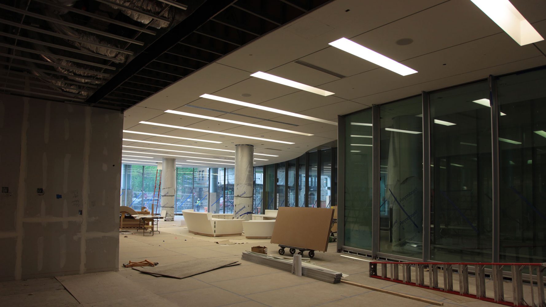 Un edificio con un diseño modular en cuadrícula y grandes plantas iguales, inherentemente flexibles y más eficientes que las de las instalaciones existentes en el campus, se extiende sobre la calle adyacente para optimizar las conexiones y la circulación programática.