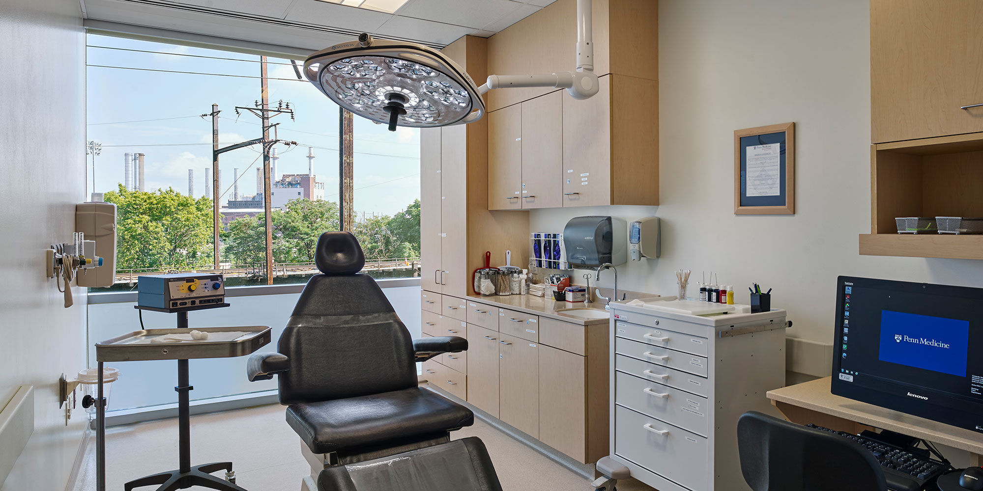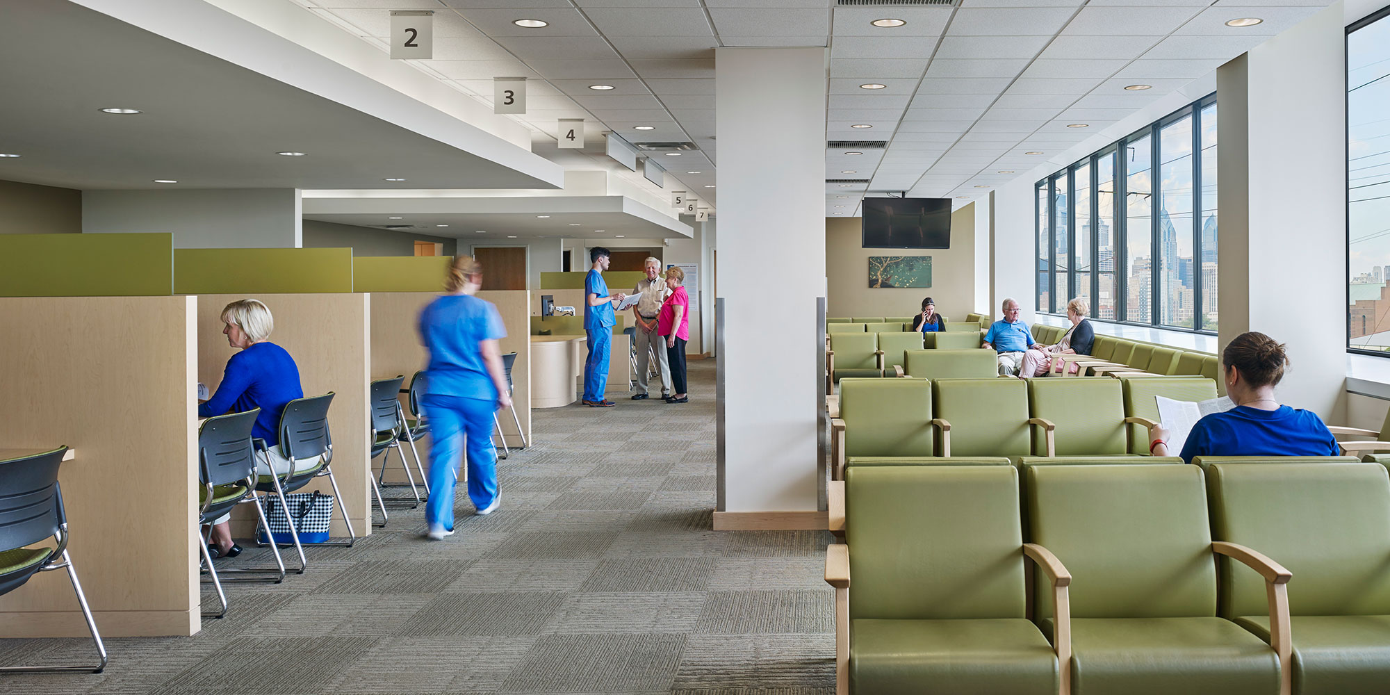 The initial phase, the Perelman Center for Advanced Medicine provides a stepping stone for future development by creating a prominent, central atrium and public plaza, and by maintaining low elevations of clinical floor plates in order to mitigate site congestion as future expansion takes place. Sight lines throughout the atrium orient visitors, while public areas and some clinical spaces and offices are placed along the building perimeter to maximize natural lighting and outward views for visitors and staff. Exceptions are made for rooms that need privacy and carefully controlled light—examination rooms, labs, and operating rooms—which are placed in the center of the floor plates. As the main teaching hospital for the University of Pennsylvania, students, faculty, and researchers use and occupy the development in addition to staff, patients, visitors, and the public.