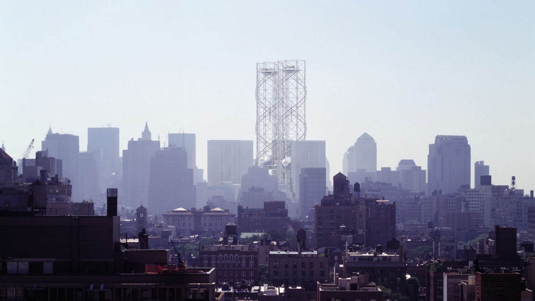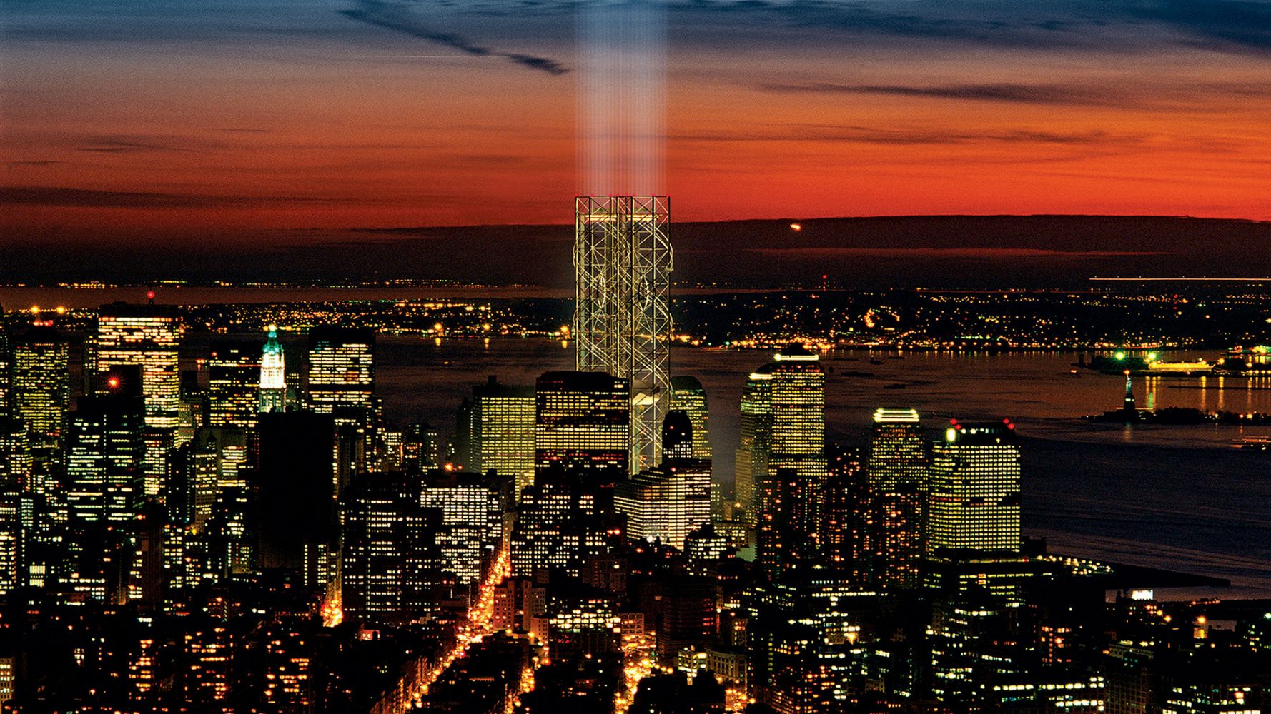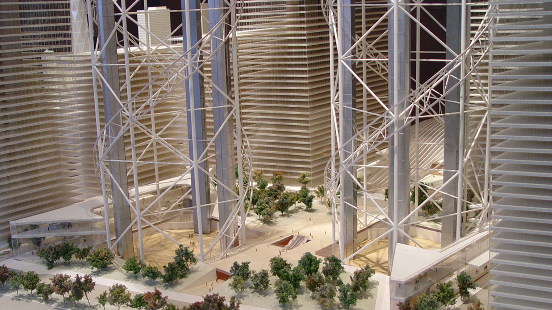 Rising around and above the footprints of One and Two World Trade Center, two open latticework towers immediately reconstruct the iconic city skyline and create a vertical infrastructure for a memorial and cultural center. Significantly, the plan situates civic uses at the centerpiece of the development, envisioning public and cultural facilities—not office space—as the primary catalyst for the revitalization of downtown. Two viewing platforms at the top of the towers ensure that the highest points remain accessible to the public, a rarity among high-rise buildings, and a performing arts center and museum of remembrance is elevated 40 stories above street level in keeping with its importance in the plan. The towers are energy-efficient as well: wind turbines on the upper levels provide electrical power to the museum and viewing platforms.