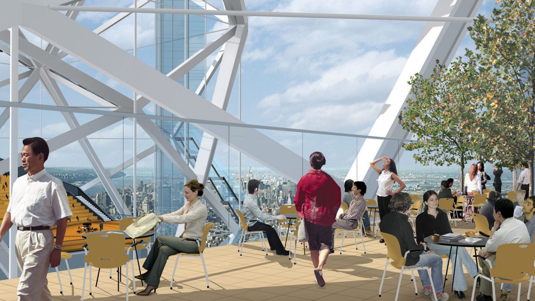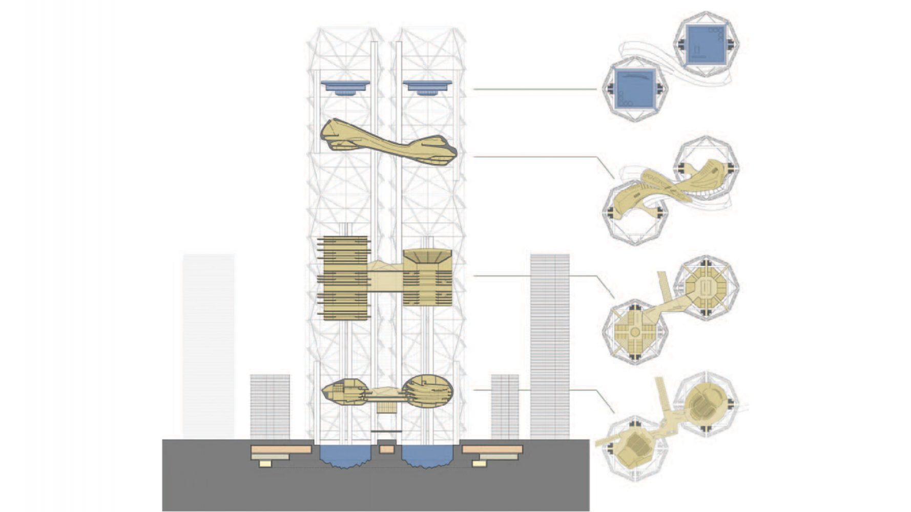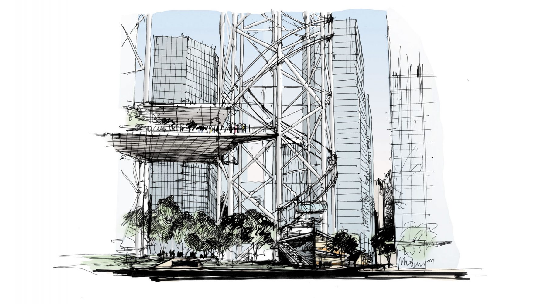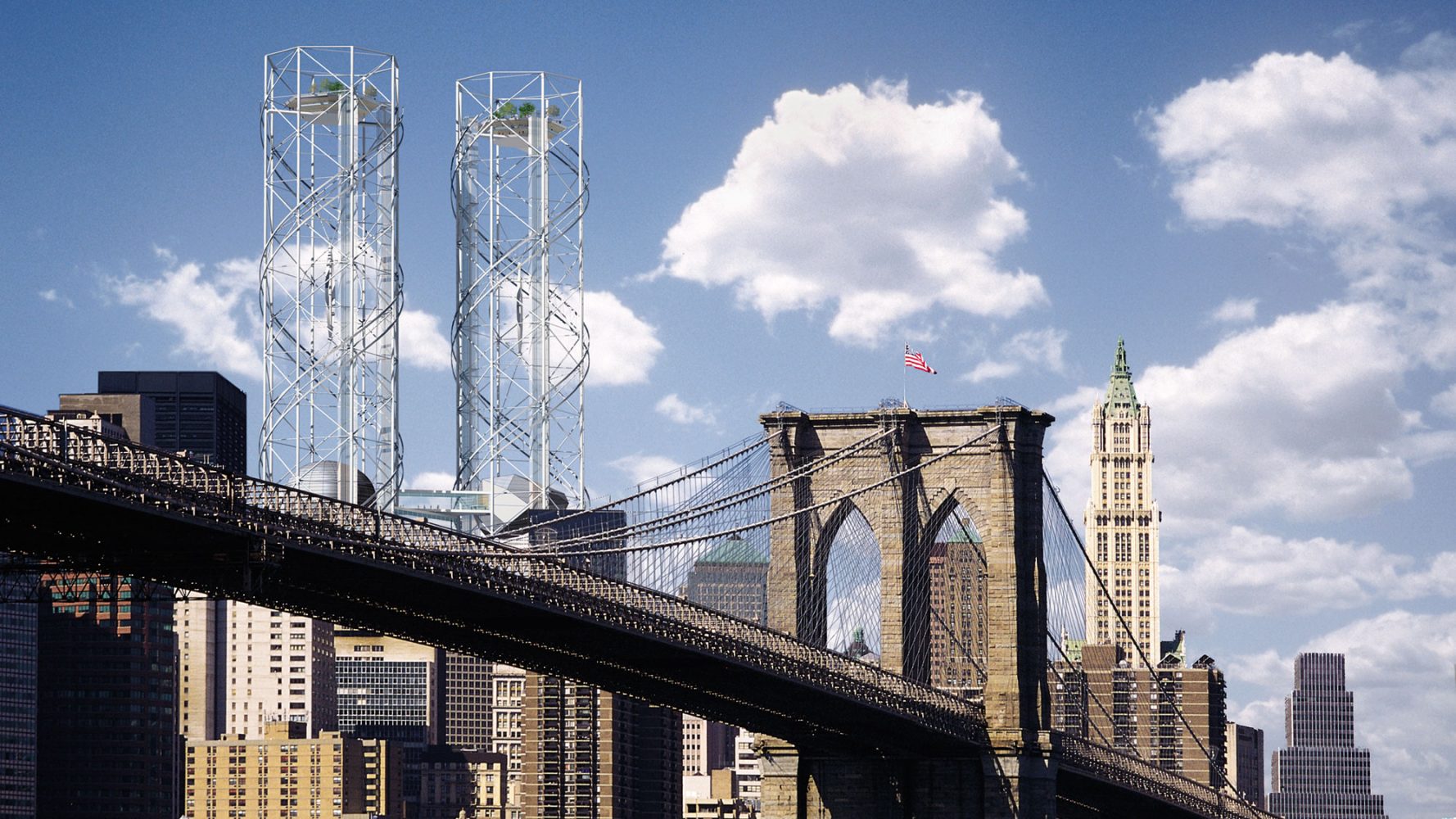 Rising around and above the footprints of One and Two World Trade Center, two open latticework towers immediately reconstruct the iconic city skyline and create a vertical infrastructure for a memorial and cultural center. Significantly, the plan situates civic uses at the centerpiece of the development, envisioning public and cultural facilities—not office space—as the primary catalyst for the revitalization of downtown. Two viewing platforms at the top of the towers ensure that the highest points remain accessible to the public, a rarity among high-rise buildings, and a performing arts center and museum of remembrance is elevated 40 stories above street level in keeping with its importance in the plan. The towers are energy-efficient as well: wind turbines on the upper levels provide electrical power to the museum and viewing platforms.